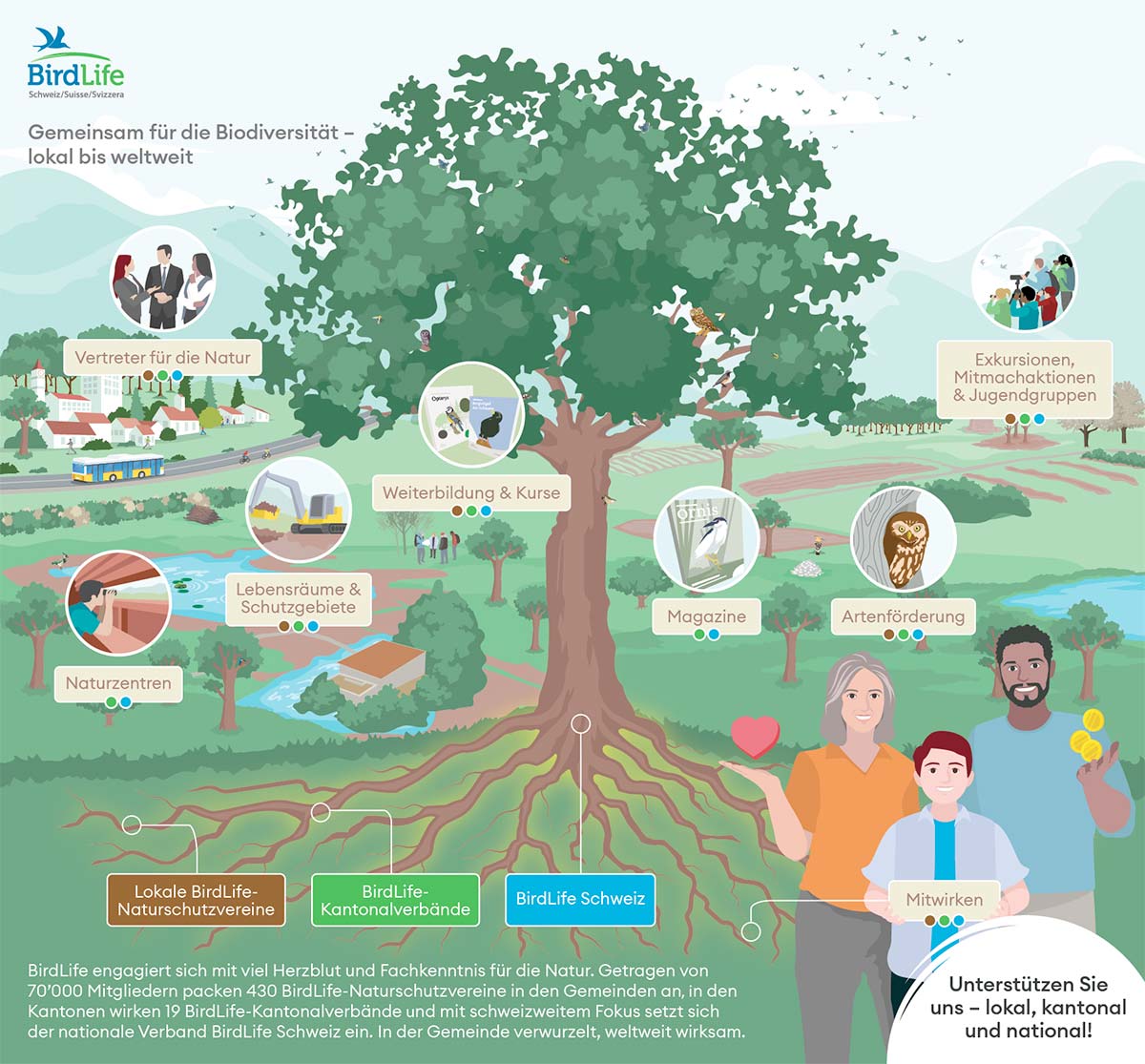 ... der Verband der über 65'000 Natur- und Vogelschützerinnen und -schützer in rund 440 lokalen Sektionen und 18 Kantonalverbänden und der Landesorganisationen Ala (Deutschschweiz) und Ficedula (italienischsprachige Schweiz). In der Romandie existiert eine Geschäftsstelle in La Sauge, Cudrefin VD.
